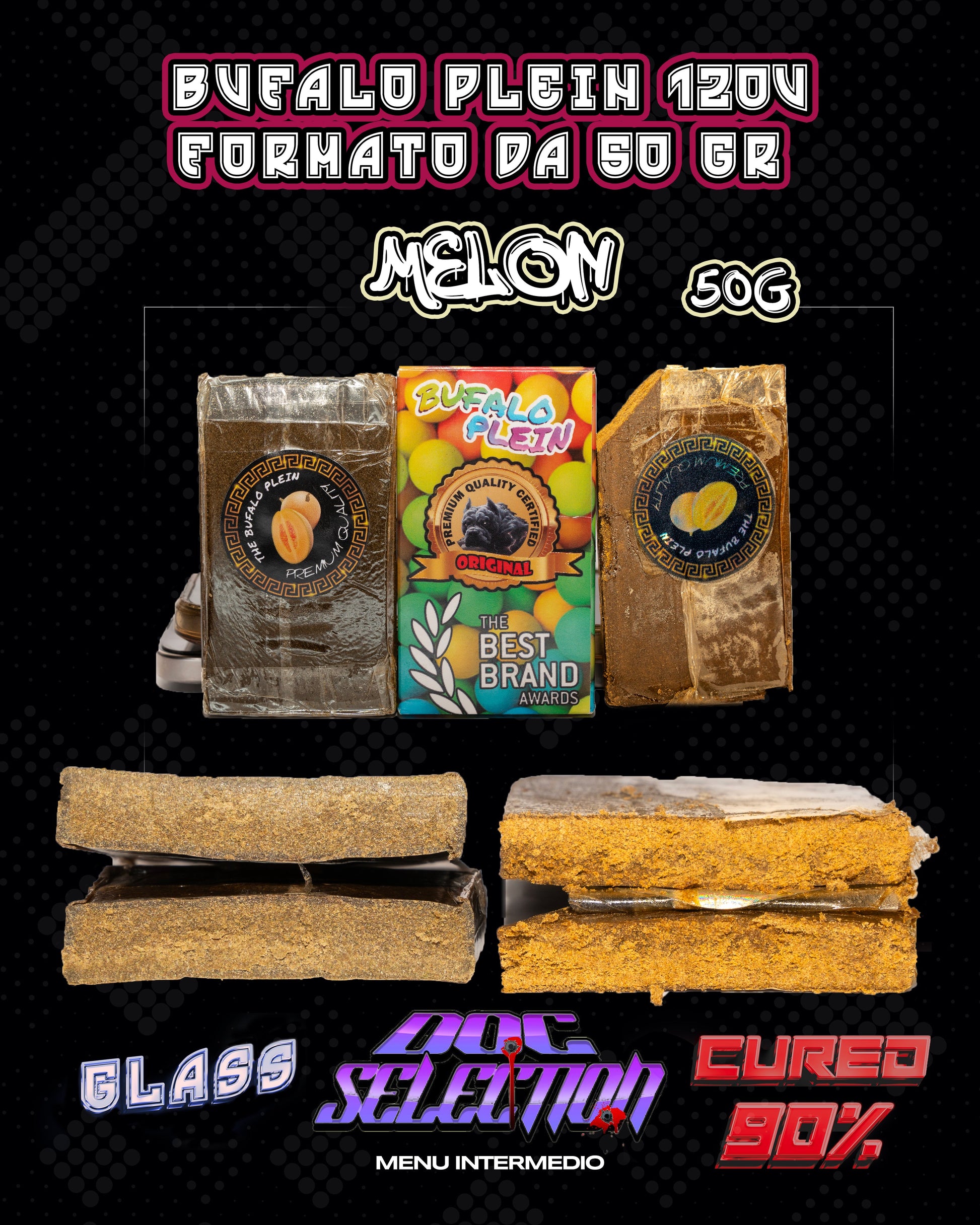 Filtrato 120u con formato card da 50gr By Bufalo Plein, ricavato dalle polveri dello strain Melon, rappresenta una scelta eccellente per chi cerca un filtrato da lavoro di qualitร ad un ottimo rapporto qualitร /prezzo.ย